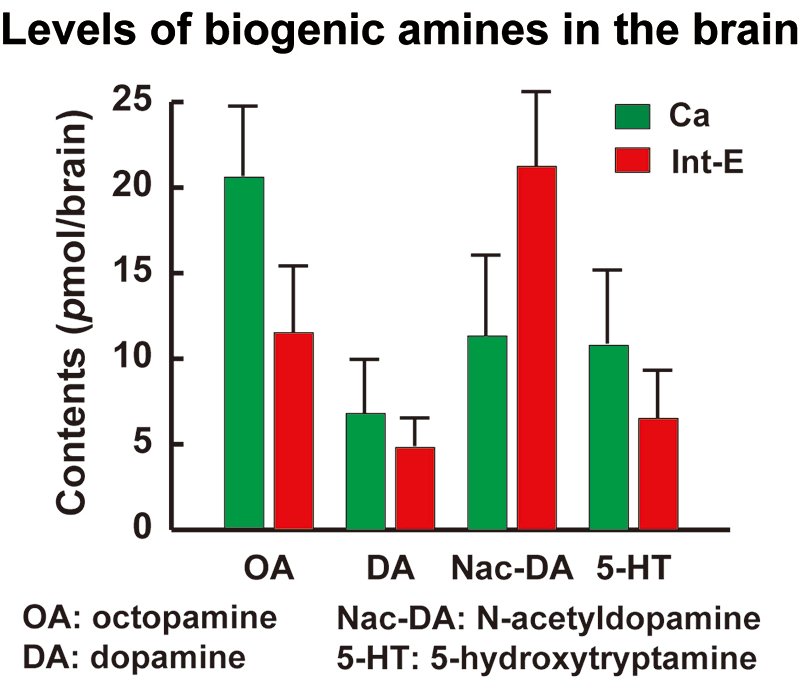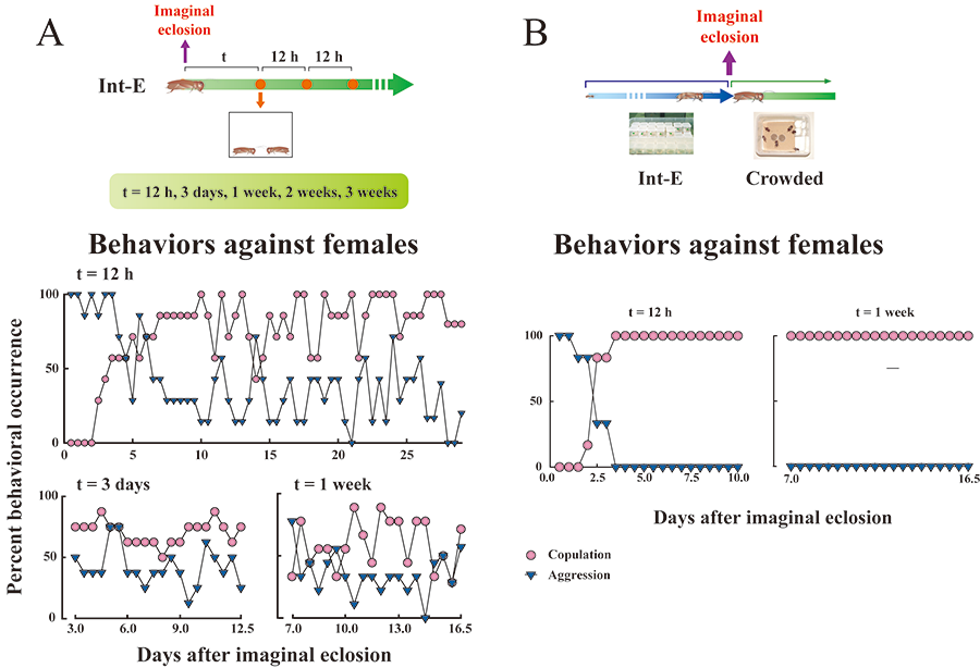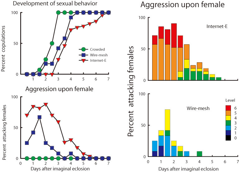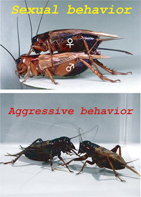 われわれの研究プロジェクトの第一の目的は、コオロギの本能行動を発現する脳内メカニズムを明らかにすることにあります。これらの本能行動は生得的なもので、遺伝的に決まっていると考えられていました。しかし、隔離などによって生育環境を変化させると、本能行動の発達や現れ方が大きく変化することが明らかになりました。そこで、生育環境が本能行動の発達や発現を調節する脳内メカニズムを明らかにすることが第二の目的です。