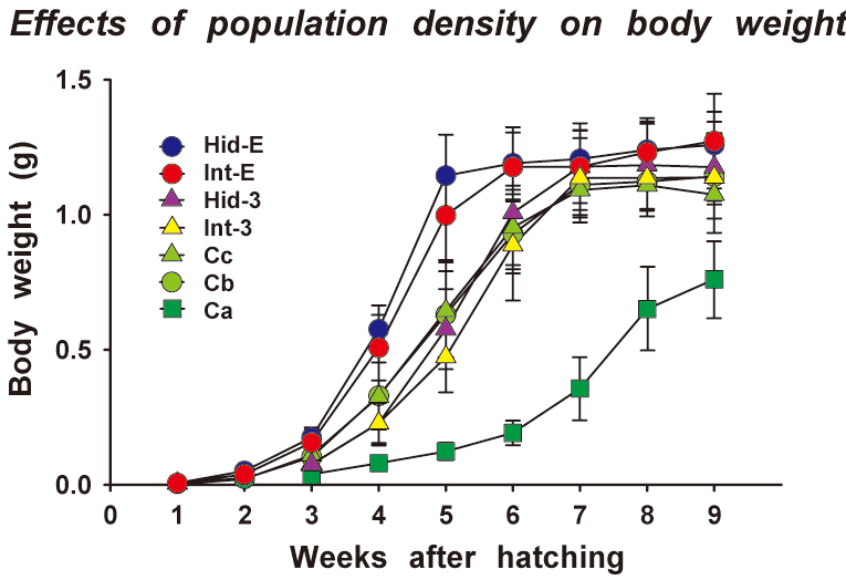 しかし、コオロギであっても環境によって、行動の現れ方がわれわれと同じように変化することがわかってきました。例えば、小さいときからエサや交尾相手などが常に満たされた贅沢な環境で育ったコオロギは、全く飛べなくなってしまいます。因みに研究で使っているのはクロコオロギという種類ですが、野生では、無着陸で 1,000 km 以上飛ぶことができます。さらに、卵の時からずっと一人っ子で育てた雄のコオロギは、大人になって生まれて初めて出会った相手を攻撃し続けて殺してしまうほど凶暴になってしまいます。生まれつき持っているはずの本能行動が、このように環境によって変化する仕組みを明らかにするために、脳内のホルモンを調べています。