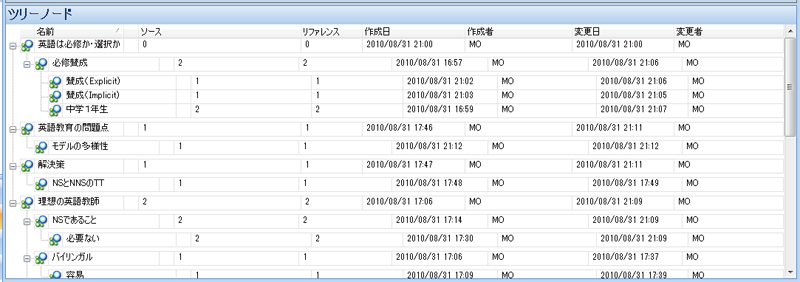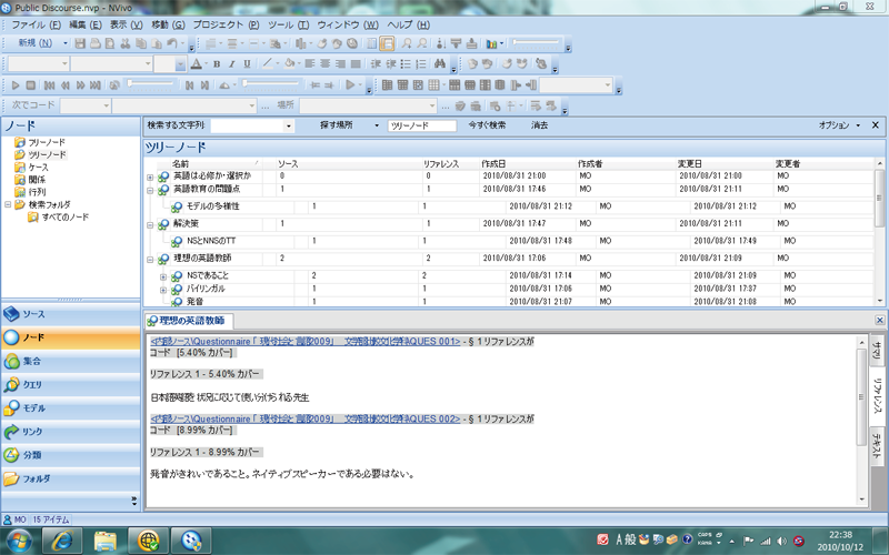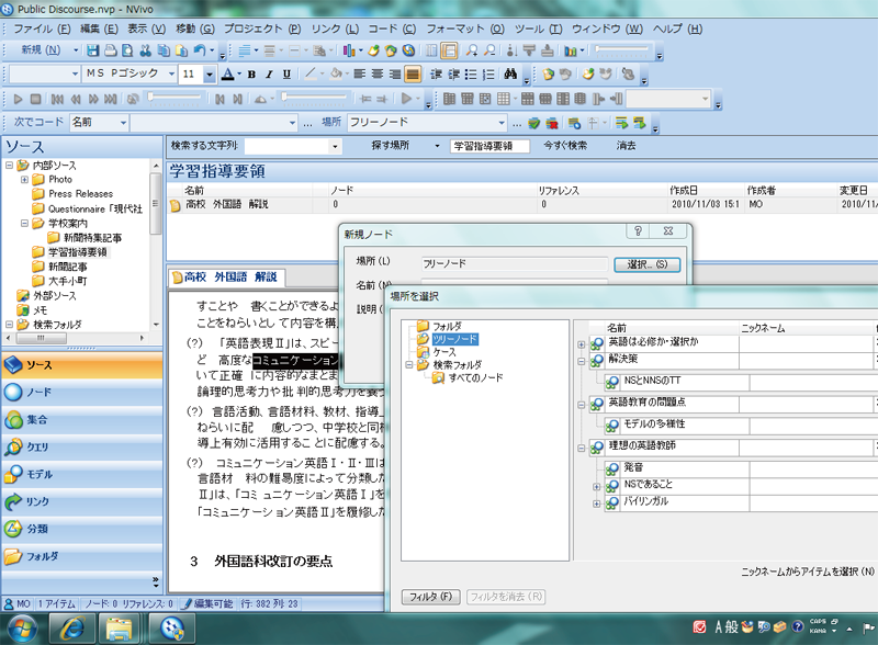 私の研究領域は「応用言語学」といって、一言でいえば言語学の理論や研究成果を利用して社会で起こる諸問題の解決に結び付けることを目的とする分野です。人文科学と社会科学の複合領域と言っていいのではないでしょうか。今回 NVivo 8 を使うことになった研究は科学研究費の基盤研究 (C) 「外国語教育政策策定におけるパブリック・ディスコースの役割」 (研究課題番号:21520596) で、新学習指導要領にある小学校の外国語活動や高校の「英語で行う英語の授業」など新しい政策が決定されるのにあたってその理由として「民意」がどれだけ反映しているのか、そしてそういった民意が形成される過程で日常生活でどのようなかたちで英語に触れているのか、またマスメディア等の影響はどれだけあるのかを調べようとするものです。