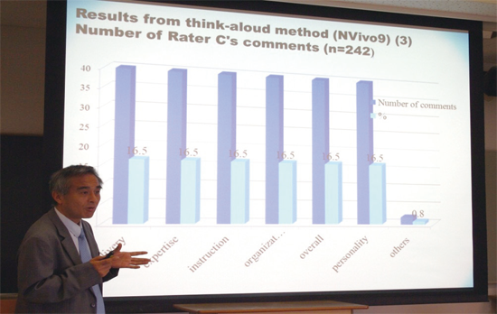 模擬授業の評価者の研究の場合、評価者が分析するための授業が必要となります。まず、教員志望の学生に実際に模擬授業をしてもらいます。後日、評価をするためにビデオに録画します。そのビデオを見ながら評価者が実際に採点したものを分析します。例えば、授業の構成・声の大きさの適切さ・熱意が感じられる・黒板を適切に使っているか等々ごとに、1点~5点まで評価者がチェックするようになっています。その採点されたデータを分析します。