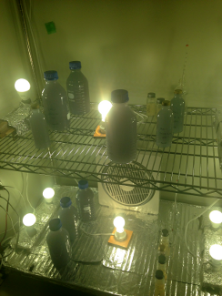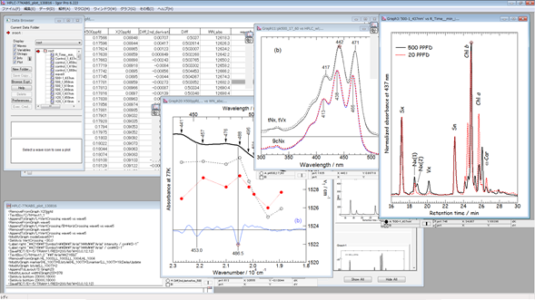 研究室内で調製された試料(光合成色素そのもの、光合成細菌から得られた色素タンパク質複合体など多種多様)、または共同研究先からの試料に光照射して測定し、得られた信号をデジタル測定器で検出、数値データをパソコンに取り込んで記録します。