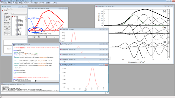 Stark吸収分光の測定データにおいてMultiPeakFittingとそのピークの微分を用いたデータを求めたいパラメータの解析に使用し、分子の光励起にともなう静的双極子モーメントの変化を決めることができました。