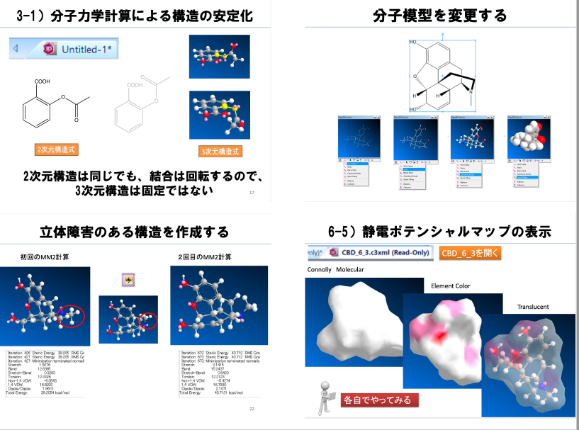 ChemOffice シリーズを扱う 1 回目の演習では、ChemDraw を使って 11 種類の医薬品の構造式を描きます。2 回目は、Chem3D を中心に、構造活性相関の基礎概念を、オピオイド系鎮痛薬を通じて学びます。後期は ①安定コンフォマーの探索、②分子運動の観察、③構造異性体と立体異性体の観察、④生体高分子と医薬品の相互作用における立体構造的要因について学んでいます。最終回は総合演習として、創薬におけるコンピュータの役割とドラッグデザインを取り上げ、医薬品合成の専門家のセミナーを受講してもらっています。