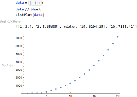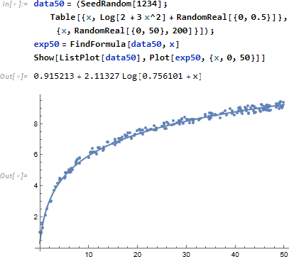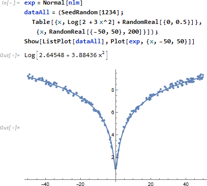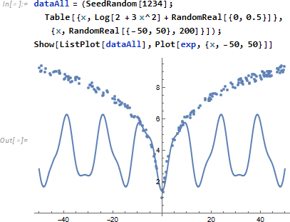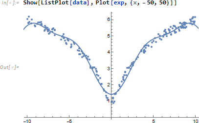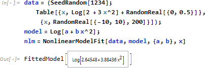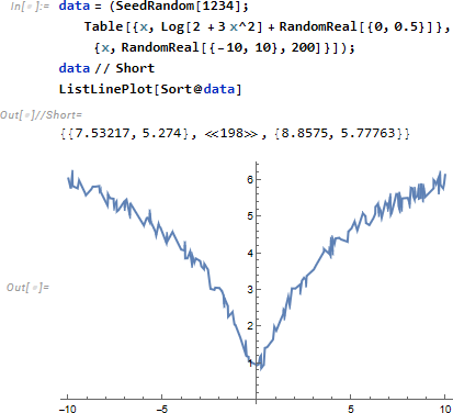 次は、x=-10 から 10 までの範囲に対し Log[2 + 3x^2] を y 値とし、さらにノイズ (0 から 0.5 までの一様乱数) を加えた複雑なデータを用意します (SeedRandom[1234] は生成される乱数列を固定するため)。