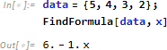 FindFormula は与えられたデータ列({x, y} のリスト)に対し、プロット近似する関数を見つけ、返します。次の例はデータ列 {1, 5}, {2, 4}, {3, 3}, {4, 2} に対し、プロット式 6-x を推定します。つまり、x=1 から 4 までは 6-x でプロット値を推定できることを表します。