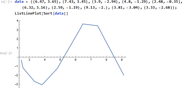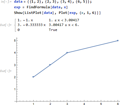 これに対し、次の例では FindFormula を実行するたびに異なる区間に分割されます。毎回異なる理由は、推定初期値がランダムに設定されるからです。また、区間に分割される理由は、情報が少ない (x=1, 2, 3 までは線形だが、x=4, 5 の情報がなく、唐突に x=6 の値が現れ、かつ、これで情報が尽きている) ためです。それでも FindFormula は推定解を生成します。なお、FindFormula は3次元以上のデータには使用できません。