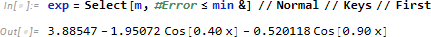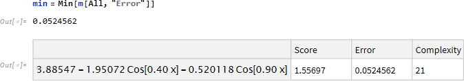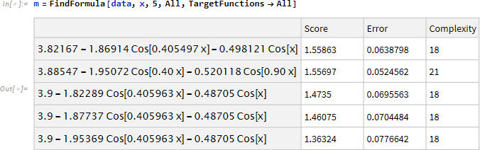 いま見てきたように FindFormula は与えられたデータに対し、複数のプロット式を推定します。次の結果は許される関数をすべて使い (TargetFunction->All)、すべて (All) の評価基準 Score/Error/Complexity を表示してます (なお、この結果は Mathematica の DataSet の形式になっています)。