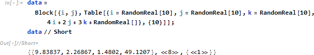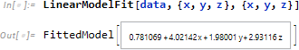 FindFormula は線形、非線形を問わずデータに Fit する式を推測してくれましたが、データの次元数は2に限定されます。一方、線形 Fit に限定すれば LinearModelFit は多次元データに関し、プロット式の推定を可能とします。たとえば4次 (3次のデータとその線形結合 4i + 2j + 3k) なる仮想のデータを用意し、