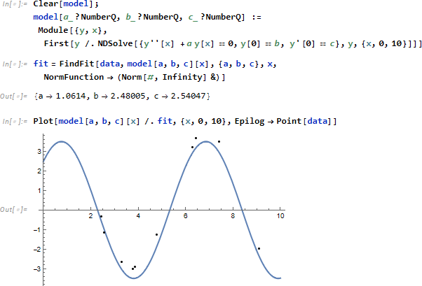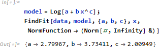 FindFit は非線形 Fit に関しては基本、NonLinearModelFit と同じですが、正則化オプション NormFunction を持つ点で異なります。正則化を行うことで、Fit 残差を縮めます、かつ使い方によっては NonLinearModelFit で生じたエラーを回避できる場合があります。ちなみにここでは推定パラメータに a, b のみならず c も指定しています。(正則化関数の詳細については NormFunciton を参照ください)