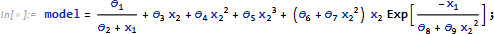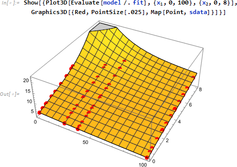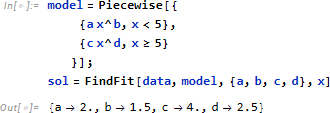 プロット点を眺めると x=5 前後で推定式の形が異なっていると見て取れるので、モデルを以下のように区間で分けて設定し、FindFit によってパラメータ推定を行います。
