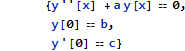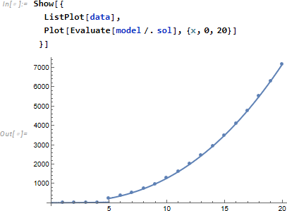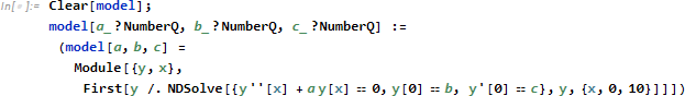 を想定し、パラメータ a, b, c を推定する事を考えます。他の場合と異なり、微分方程式自身を中核に据え、パラメータを引数とする関数として model を定義します。そして Fit 計算時、x を変化させながら微分方程式を解く (NDSolve)ことを繰り返し、データ系列にフィットする a, b, c を推定します。したがって model 引数 a, b, c が数値に限定するよう ?NumberQ を付けているのは意味があります。
