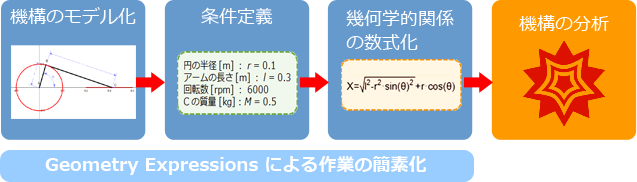 Mathematica を使った 「平面リンク機構」 の分析事例は、スライダクランク機構をはじめとしてウルフラムのサイトでも幾つか紹介されています。機構 (メカニズム) をモデル化し、その力学的性質を研究するという分野です。しかし、この最初の段階、すなわち、機構を Mathematica でモデル化するという作業は、それをあらわすコードを一から作成することになりますので、結構手間がかかります。ここでは、平面リンク機構の 「モデル化」 から 「数式化」 を担う部分に幾何学モデルソフトウェア Geometry Expressions を使用することで、作業を大幅に簡素化、効率化できることを紹介します。