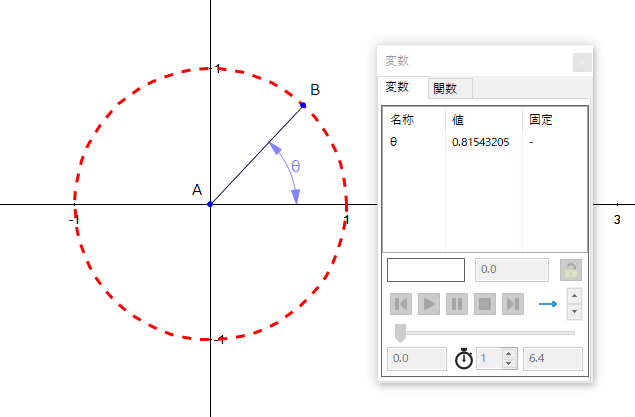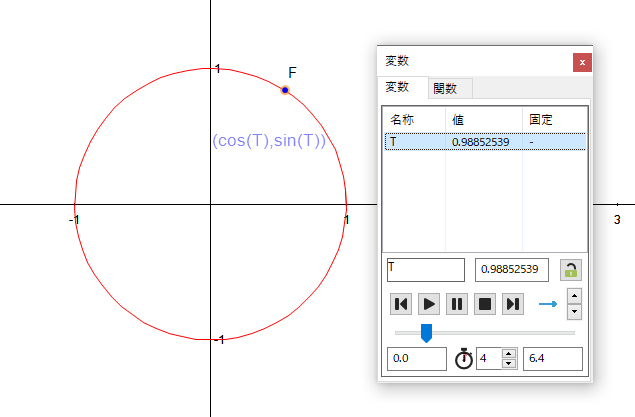 次に、回転運動に関する定義です。回転運動をあらわすには2つの方法があります。ひとつは図形として直接円と半径を描画して、角度 θ を変化させる方法です。もうひとつは、パラメトリック関数で円を定義して、そのパラメータ T を変化させる方法です。