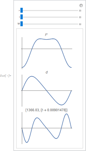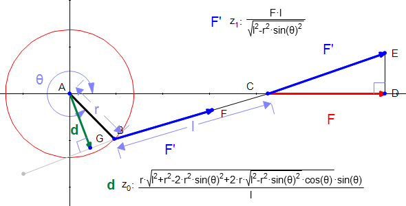 アーム方向の力 F’ の大きさと、距離 d の関係式については、Geometry Expressions で幾何学的に求めることができます。少し長い数式なりますが、得られた F’ と d の数式をそれぞれ Mathematica にペーストします。