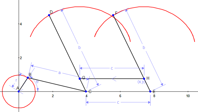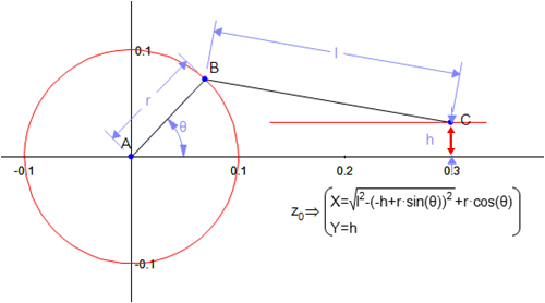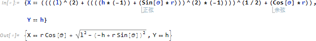 オフセット型のスライダクランク機構は、X 軸から点 C を切り離して、点C と X 軸との間に距離の条件として、新たに h を設定するものです。Geometry Expressions の作図によって得られる数式は以下のとおりです。これによって、C の往復運動の軌跡をあらわす数式に変数 h がどのように関与するかが即座にわかります。