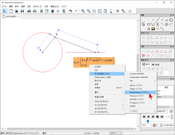 Geometry Expressions で設計した機構の点 C のスライド運動をあらわす数式を出力したら、その内容をコピーして、 Mathematica にペーストします。