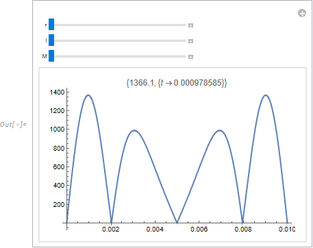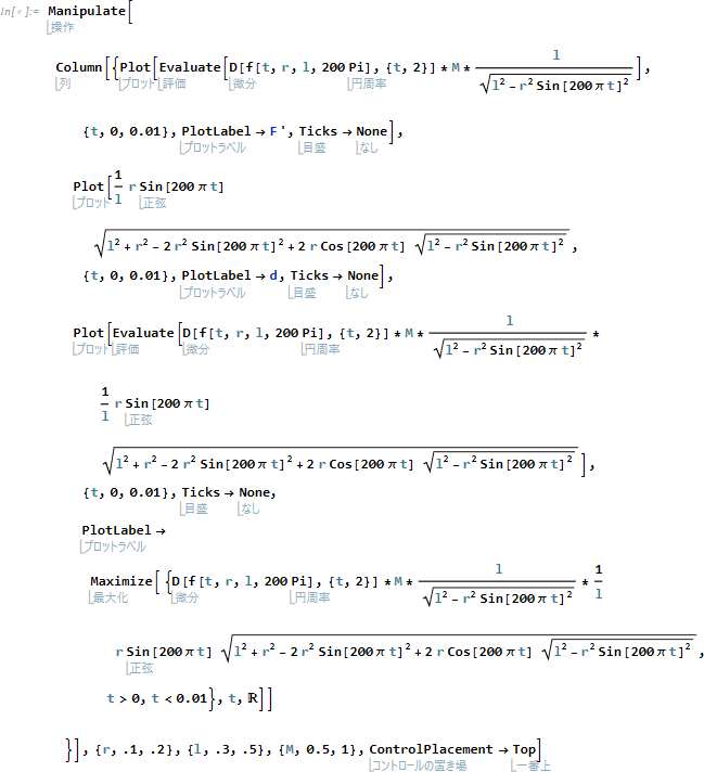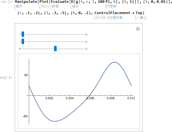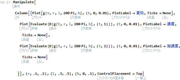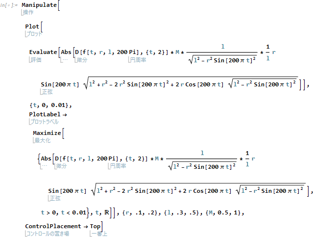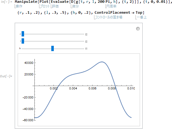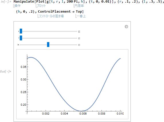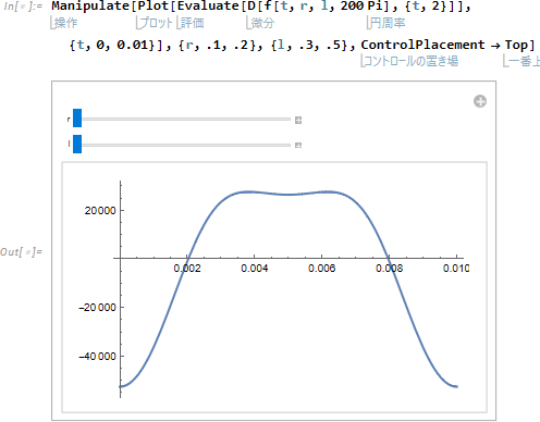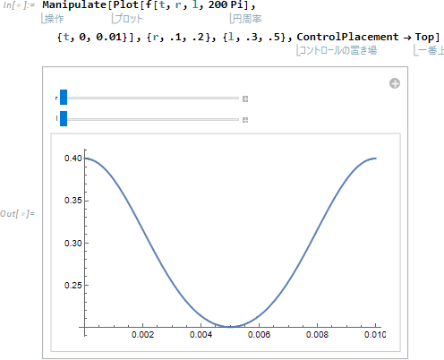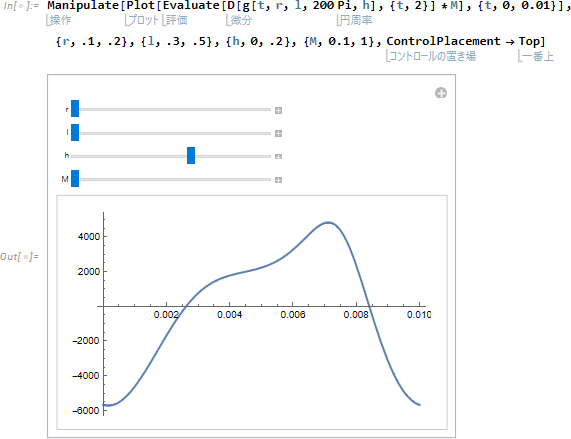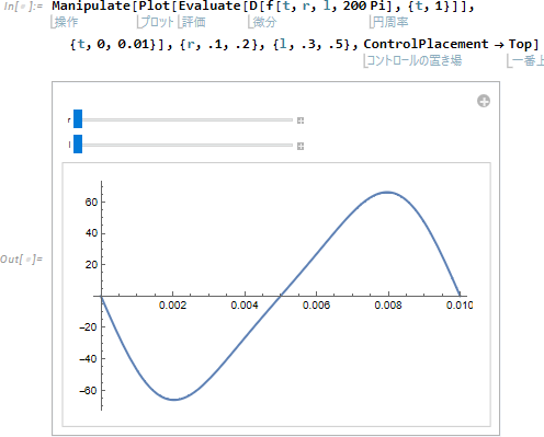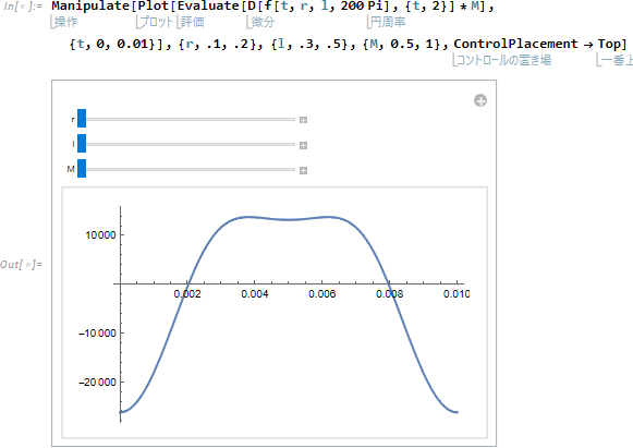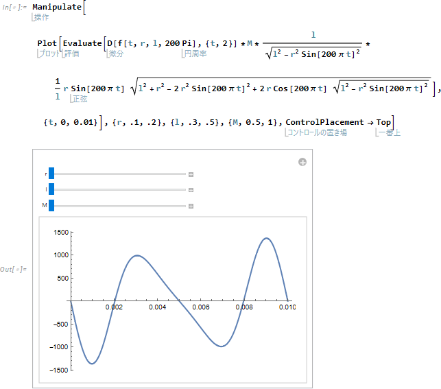 定義した関数 f をそのままの形で時間 t についてプロットします。つまり x 方向の変位をあらわすプロットになります。パラメータには r と l と ω がありますが、ω は要件から回転数:6000 rpm より ω = 200 π を代入します。円の半径 r とアームの長さ l が変われば、結果がどう変わるかをインタラクティブに分かるようにするため、Manipulate 関数を使います。Manipulate では半径 r とバーの長さ l の2つのパラメータを変化させます。r と l の初期値には、要件にあわせて 0.1 と 0.3 を定義します。また r と l 範囲には、それぞれ、0.1 ~0 .2、0.3 ~0 .5 を定義しています。時間の範囲は1回転分の、ゼロから 0.01 の範囲を定義します。