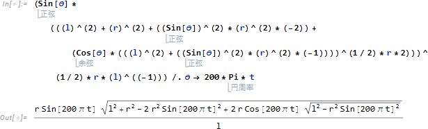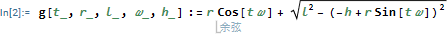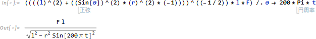 Mathematica にペーストしたパラメトリック関数の X 部分の式を利用して、変位をあらわす関数 f を定義します。※ここで、θ を、角速度 ω と時間 t の積に置き換えます。