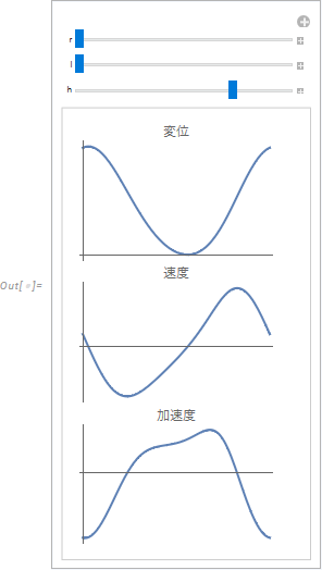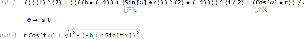 この数式を先ほどと同じ手順で Mathematica で処理すると、h を導入したことで、スライダクランク機構の挙動がどのように変化するかを確認できます。