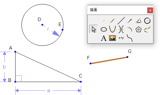 Geometry Expressions で幾何学的図形を定義するには2つの方法があります。もっとも直接的な方法は、描画要素を選んで図形を定義する方法です。円を描くにはマウスで円の中心をクリックして、半径をドラッグして指定します。直線を描くには始点と終点をマウスでクリックするだけです。直角三角形を描くには3つのラインを描画して、条件として各辺に長さを設定したり、2辺の間に角度を設定するだけです。