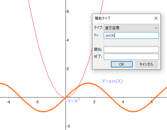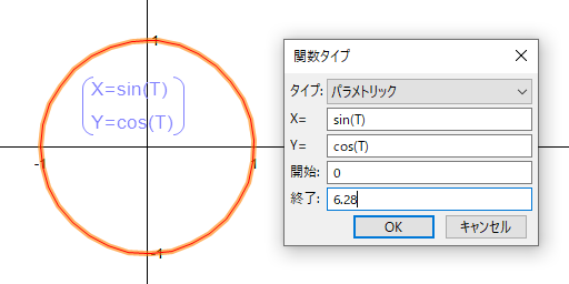 幾何学的図形を定義するもう一つの方法は、関数を定義することです。直交座標に Y = X2、Y = sin (X) といった式を定義して放物線や正弦波を描画したり、パラメトリック座標を使って、パラメータに T を使って、sin (T) と cos (T) で円を描画することができます。※直交座標で利用できる独立変数は X、パラメトリック関数で利用できる媒介変数は T に限定されます。パラメータには任意の文字を利用できます。