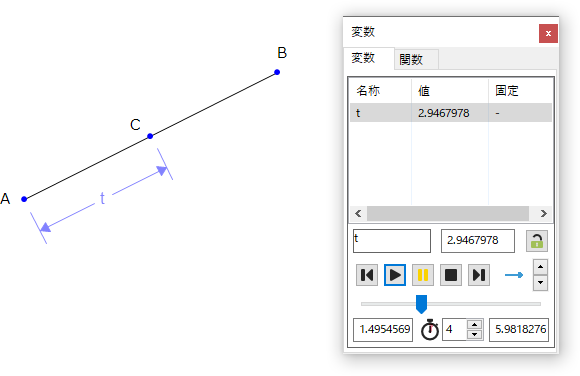 もうひとつ重要な要素は、運動に関する定義です。まず、スライド運動に関する定義です。例えば、直線上にある1点を移動させたい場合。まず、直線 AB を描画します。直線上に点 C を配置します。AC 間に距離 t を定義します。t を変化させることで直線上の点 C を動かすことができます。