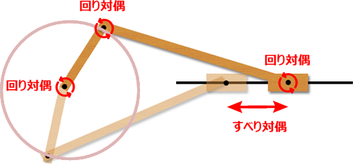 スライダクランク機構とは、機構学的には3つの 「回り対偶」 と1つの 「すべり対偶」 で結び付けた機構であると定義されます。回転運動とスライド運動が連動するメカニズムです。