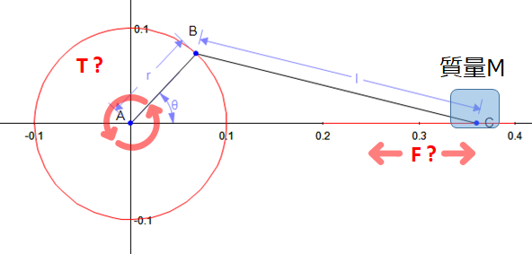 上記要件からスライド部分にかかる力 F の大きさを求めます。さらに、力 F にもとづいて最大トルク T[N・m] を求めます。(※問題を単純化するために慣性力や摩擦力といった要素は除外します)
