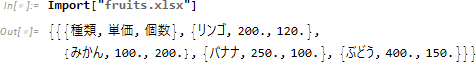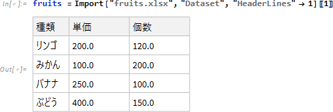 fruits = Import[“fruits.xlsx”, {“Dataset”, 1},”HeaderLines” -> 1]
