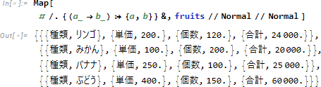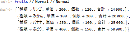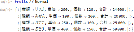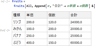 Dataset は高速にデータを処理できる一方、加工に弱いという誤解が広まっていて、加工したいときは、いったん Association に変換し、その上で加工し、再度 Dataset に戻すという習慣が広まっているようです。たとえば、以下のような要請「Dataset fruits に合計 (= 単価 * 個数) 欄を追加する」にも、新規カラムの追加で簡単に対応できます。