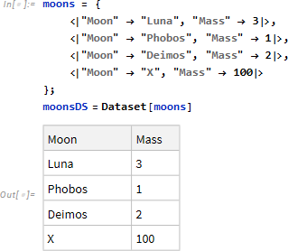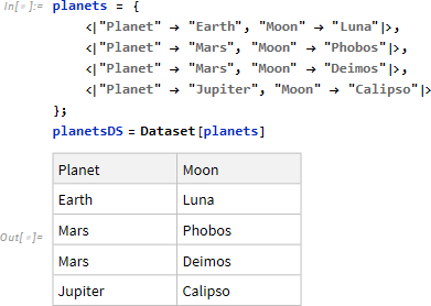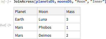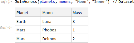 一方、Mathematica のヘルプには、たとえば、guide/DatabaseLikeOperationsOnDatasets のようなページはあっても Dataset に対する具体的な操作例は紹介されていません。対策は簡単で、Association に対する操作から連想します。次は JoinAcross の例で、月 moon をキーに2つの Dataset を結合します。