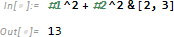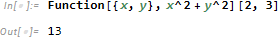 この例は2つの仮引数 xy からなっています。実引数 2 と 3 を得て、結果 13 を返します。