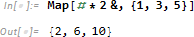 Map はいまやどのプログラミング言語でも一般的になってきましたが Mathematica では ver1.0 のときから導入されています。仕掛けは単純でリストの各要素に同一関数を適用した結果のリストを返します。たとえば、リストの各要素を2倍するには次のように書きます。