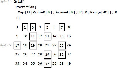 ここで Map 関数を Grid および Partition と組み合わせたこんな例を紹介します。素数を囲む四角は Framed を使い作っています。