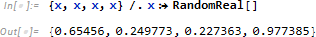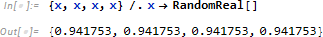 では、 の左辺 (今の場合、x) の置き換えが起きるたびに、右辺 (今の場合、RandomReal[]) が評価され、代入されます。