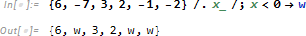 与えられたリストに対し、負の要素を w で置き換える状況を考えてみます。この例は次のように読みます:{6, -7, 3, 2, -1, -2} の要素を x で置き換えます。ただし、この状況では x が何を指すのか不明です。続けて /; 以降をみると具体的に x が指定 (0未満) されています。ついで、そんな xw で置き換える指示を Rule -> によって出しています。