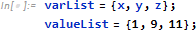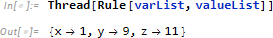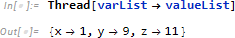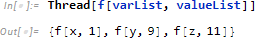 関数 f を変数リスト varList と値リスト valueList に適用し、串刺し f[x, 1], f[y, 9], f[z, 11] からなるリストを作ります。