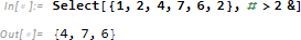 {1,2,4,7,6,2} の各要素 # に対し、2より大きいものを集めリストで返します。