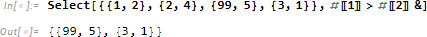 {{1,2},{2,4},{99,5},{3,1}} の各要素、たとえば {1,2} に対し1番目が2番目より大きいものだけを集めます。