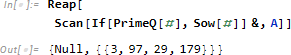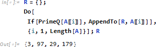 素数だけを取り出したリストを計算します。 (AppendTo は副作用として第1引数に第2引数が追加される。)