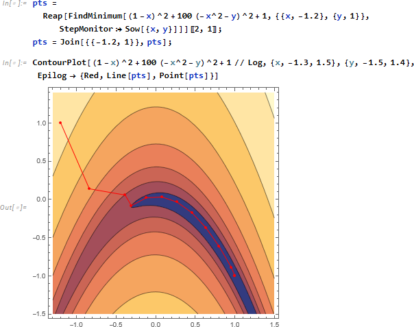 次は関数 FindMinimum のヘルプから引用する例ですが、FindMinimum が行う近似計算の途中解を Sow で集め、最終的に Reap で回収した内容を pts に代入し、元式に対応する等高線プロット上に pts の軌跡を描画します。