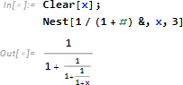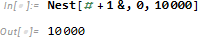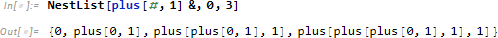 これに対し Nest 関数を使ったものを紹介します。Nest 関数は NestList 計算の最後の値となります。次の例は初期値 0 に対し、関数 plus[#,1]& を3回自己適応します。つまり、# には最初 0 が入り、その結果 plus[0,1] が再度 # に入り、plus[plus[0,1],1] となります。これを3回繰り返します。
