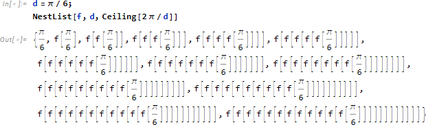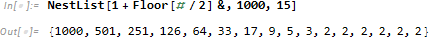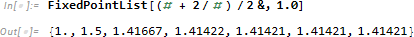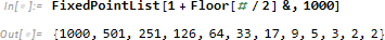 FixedPoint 関数は Nest と類似します。違いは自己適用において事前の値と現在の値が等しくなると自動的に繰り返し適用を終了する点にあります。次の例は自己適用計算を15回繰り返しています。ただし、後半は同じ値 2 が続いています。