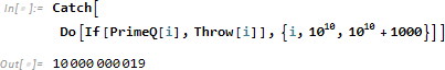 次の例では 1010より後で最初に来る素数を見つけます。Break はそれ自身を囲む最小単位のループから脱出するのに対し、Throw は任意の深さから Catch までジャンプし脱出します。かつ、Break が単に繰り返しを中断するのみなのに対し、Throw は値を持ち帰って処理を中断します。