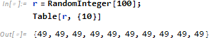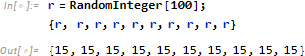 Mathematica では記号 = は割当てと呼ばれ、= の右辺を評価し、その結果を左辺に束縛します。この場合、1行目で評価され r に束縛された「(乱数) 値」が、2行目 Table 内で置き換えられています。この段階で r の値は決しているので、すべて同じ値のリストが返ってきます。