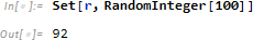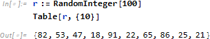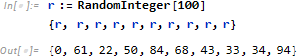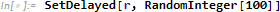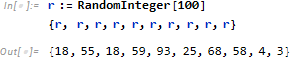 := で定義した場合、左辺のシンボルが「実際に使われる」時まで、評価が遅延されます (1行目) 。2行目で r の値を計算するたびに rRandomInteger[100] と置き換えられ、遅延されていた評価が実行されます。