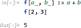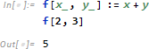 ではマッチした引数を関数本体 (右辺) で使いたいときはどうすればいいでしょう。引数にシンボルを追加します。2 が x にマッチし、3 が y にマッチし、2 + 3 = 5 を計算します。
