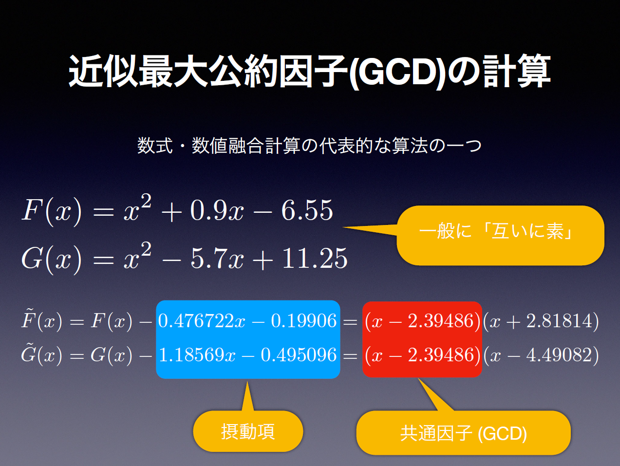 アルゴリズム研究では数式・数値融合計算のアルゴリズムの研究を行っています。係数に誤差を含む多項式に対し、係数に誤差の範囲で接動を加えた際に存在する可能性のある最大公約因子(いわゆる「近似最大公約因子」)の計算アルゴリズムの研究を進めています。