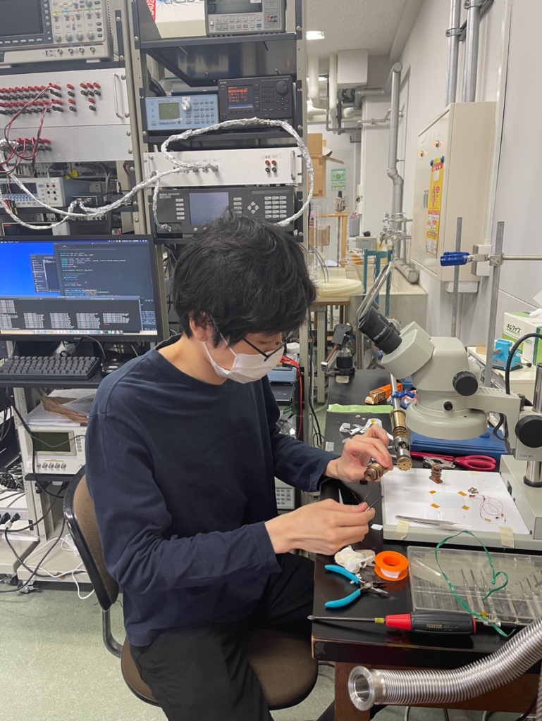 私たちの研究室では,電気を流したり磁性を示したりする有機物,分子性導体の物性研究をしています。特に,圧力をかけることにより,絶縁体であったものが金属的な電気伝導を示しさらには超伝導を示すような,圧力誘起超伝導に興味をもってそのメカニズムを調べる研究をしています。3万気圧までの圧力を発生させられる圧力容器にサンプルを入れて,0.3ケルビンまで冷やし,16テスラまでの磁場をかけて,電気抵抗測定,磁化測定,インピーダンス測定などさまざまな測定を行って,物性の評価をしています。