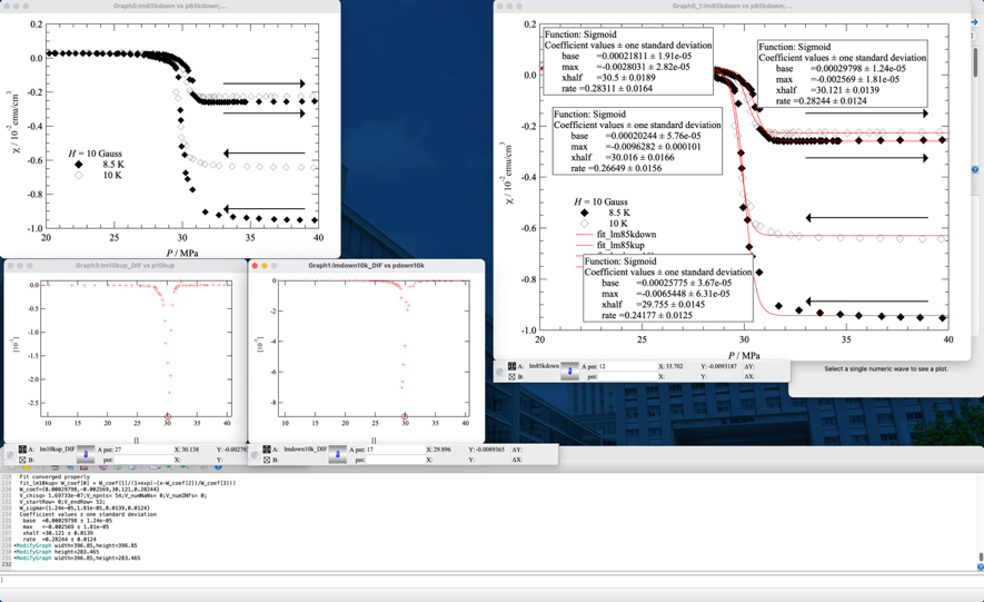 X線による構造解析,電気抵抗測定,磁化測定,インピーダンス測定,µSR測定などほぼすべての実験結果をグラフ化,モデルフィッティングする際にIgor Proを使用しています。特に我々の研究室では圧力下における測定を行っているので,一つの試料に対して圧力を変化させていくつもデータを取ります。実験を行いながら簡単な解析を行って,次は圧力をどの程度増やそうかなどのプランを練るのですが,その際もIgor Proでグラフ化と解析を行っています。解析は色々なパターンを試すことも多いのですが,それらの過程をエクスペリメントファイルの中にnoteとして残したり,グラフに書き込んだりが簡単にできる点も便利だと思っています。共同研究者と議論する際の簡単な資料を作成するところまでIgor Proのレイアウトで行うこともあります。 我々の研究室には留学生や外国の方がいらっしゃることも多いので,Igor Proは英語版を購入させていただいています。